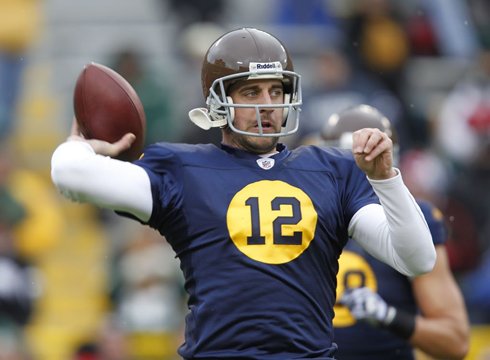 Green Bay Packers quarterback Aaron Rodgers warms up before an NFL football game against the San Francisco 49ers Sunday, Dec. 5, 2010, in Green Bay, Wis. (AP Photo/Mike Roemer)