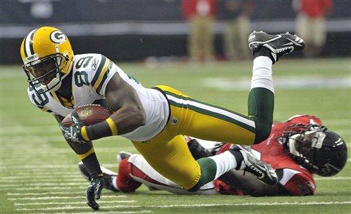 Green Bay Packers receiver James Jones (89) flies out of the tackle of Atlanta Falcons defender Stephen Nicholas in the first half of an NFL football game at the Georgia Dome in Atlanta on Sunday, Nov. 28, 2010. (AP Photo/Rich Addicks)