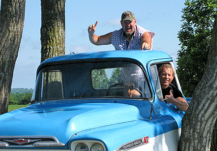 This weeks episode (March 1st) of “Only In America” With Larry The Cable Guy featured a visit to a good pal Mark Madson’s place in Clinton Wisconsin where Mark showed of his truck in the tree (as the picture below shows), dynamited some limestone, and floated the future Packermobile on a lake.  It was quite a humorous segment and we really enjoyed watching Wisconsin be represented once again for it’s unique and peculiar things and people.