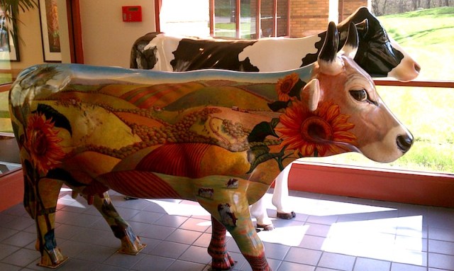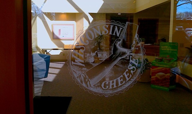 We want to give a big shout out of thanks to the Wisconsin Milk Marketing Board for their assistance in helping us move things along with the many artisan cheesemakers throughout Wisconsin. When it comes to innovative internet marketing, these guys really have it down pat with sites like Eat Wisconsin Cheese, Cheese Cupid, The Grilled Cheese Academy, and our favorite Cheese & Burger. We had a terrific lunch with them while in Madison and look forward to working out all sorts of cheese things with them throughout our shooting schedule in August. In the meantime, enjoy the painted cows in the lobby of their offices and go check out those websites.