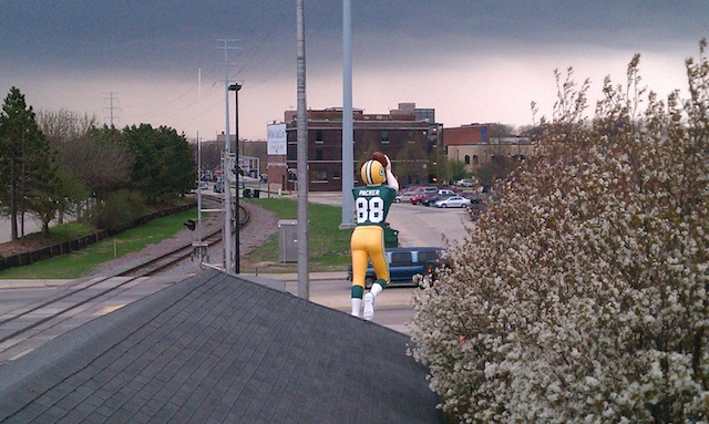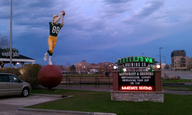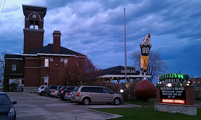 Beyond Titletown’s name and distinct link to the history of Green Bay (see below), they also had one awesome characteristic in front of the building that gave us pause for thought of the memories of visiting the old GreenBay Packers Hall Of Fame back in the 70’s and early 80’s, that of the Packers wide reciever statue that iused to be in front of the HofF, but is now adroning the front lawn (impressively so) of the Titletwon Brewing Company.