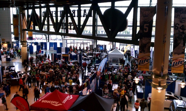 Having worked with the Green Bay Marathon to cover said event, we were also able to go inside the Lambeau Field Atrium with cameras for the Prevea Health Expo that was taking place the same weekend in conjunction with the marathon.  While there we got some terrific footage of the otehr unique uses for the Lambeau Field Atrium, including the expo and a wedding party who was more than happy to go on camera with a “Go Packers” scream.  It was a rainy but fun day and we had a great time getting some spectacular shots on such hollowed ground.  More photos of the marathon (which takes place in the Lambeau Field parking lot each year) will be posted in the next day or so.