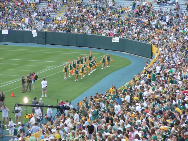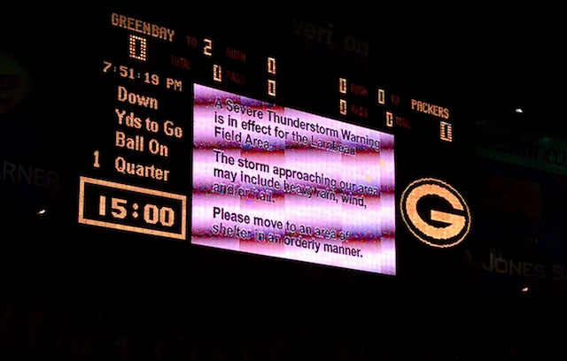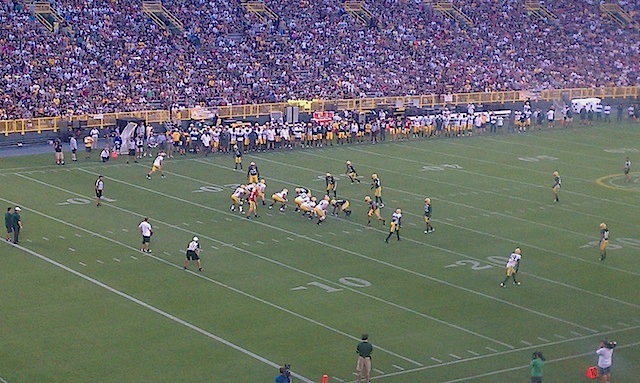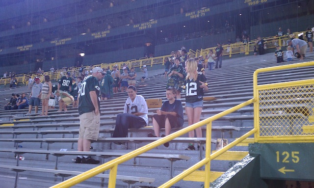 As if winning a Super Bowl wasn’t enough in this stormy Year Of The Cheesehead, the Packers Family Night 2011 was a storm in and of itself, literally. Barely a half hour into the event, thick black clouds darkened out the setting sun and gave us the impression that nature wasn’t going to let the night go uninturrupted. And a short time later it accomodated, forcing the staduim to evacuate into the protective concourse for over an hour.
