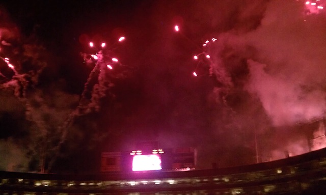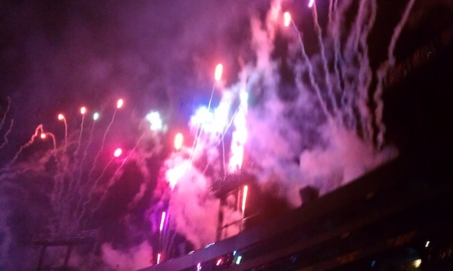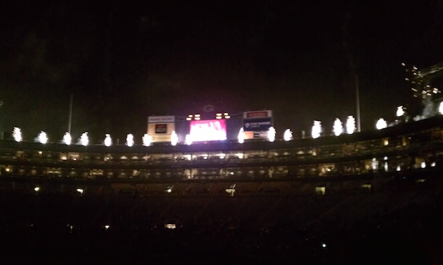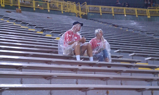 Ultimately, however, we were all allowed back into the bowl once the worst of it had passed, though the rain was still pouring down. Of course one can’t miss the chance to be at Lambeau Field during inclement weather without taking part in it so that’s exactly what we did, and got soaking wet in the process. Alas, there was a happy ending to the evening with a fantastic show of fireworks (see photos) to the delight of all of us Cheeseheads…