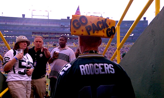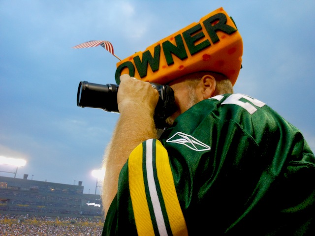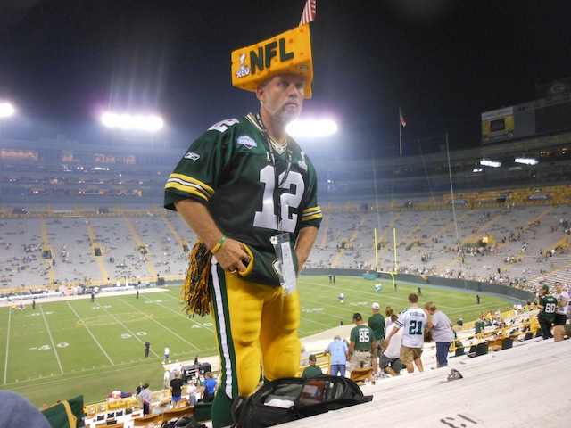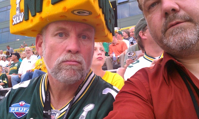 Despite it being a pre-season game, it was the first time documentary producer John Mitchell got a chance to see a real game at Lambeau Field when his good friend and Super Fan – Steve “The Owner” Tate – took him to the Packers-Chiefs final pre-season game of the 2011 season. Note that in some of the photos you can see that Steve is being interviewed by a couple of film crews that were not ours, those being “The Tonight Show” and subsequently “The Today Show”, both of which he ended up actually appearing on. We’ll add those links when we get a chance. In the meantime, enjoy us doing to Steve what he so often does to us on Facebook, putting up all sorts of cool pictures of him… We love you Steve and you know it…