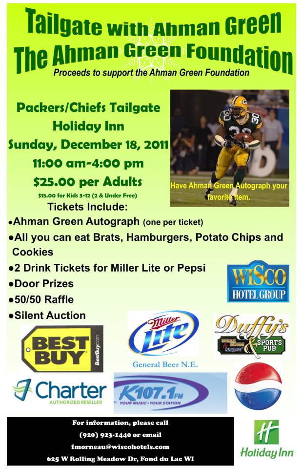 The Wisco Hotels location Holiday Inn in Fon Du Lac will be hosting a tailgate charity event on December 18th with special guest Packers altime leading rusher Ahman Green, along with several of our Super Fan friends who will be in attendance. Meet Ahman, get his autograph, and help out a good cause at the same time. Information is below, or chech out their fan page on Facebook HERE: Wisco is also known for other charity events including their yearly food drive so bring by a few cans of non-perishables and drop them off while you are there. If you can’t make the event, you can still drop of food donations at any one of their 11 Wisconsin WISCO locations (See ads below)…