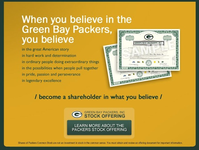 Since some of us working on the documentary are proud shareholders of the Green Bay Packers, we thought it well suited to post evidence of that and share how we feel about such a thing. Interestingly enough a fellow Cheesehead by the name of Ryan Glasspiegel who writes for the Sports Rapport wrote a far better summation on the topic than we’ve seen anywhere else so we suggest you check that out on our friends website BrentFavre.com, an article entitled What It Means To Be A Packers Shareholder… For postarity, we’ve posted a shot of our stock a and few other things here promoting the current round of stock sales by the only publicly owned professional sports franchise in the world, The World Champion Green Bay Packers.