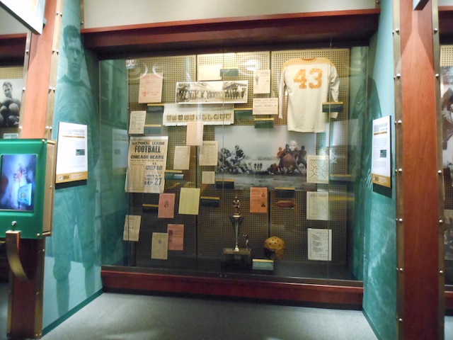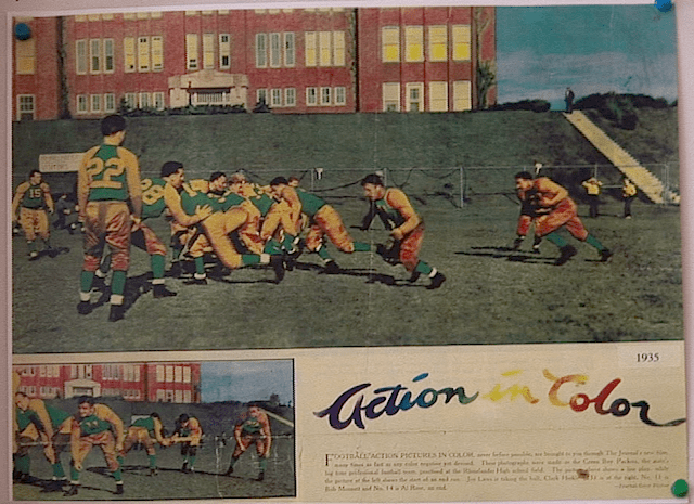 In commenoration of the Green Bay Packers winning their 14th game this season, the first time in team history, it only seemed fitting to post a few photos from ever so long ago. These are a few photos we shot along our journey this past year, one of which appears to be (or so we were told) the very first full color photograph of the Green Bay Packers from 1935 while playing at the Rhinelander High School in 1935 (bottom photo). We found that photo in the Rhinelander Mayor’s office while interview Mayor Dick Johns, who graciously let us photograph and record it for the documentary.
