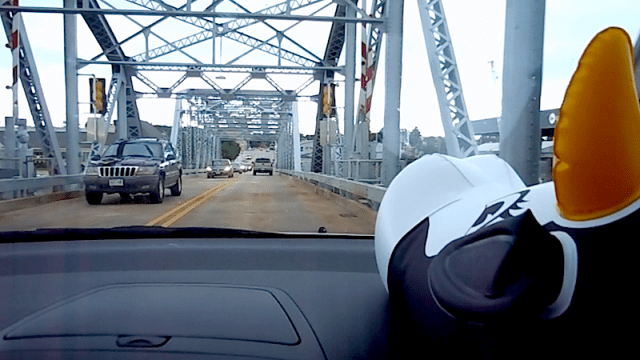 Our travel companion Lexxy The Cow watching with excitment (not that you would notice since she always has that same smile) as we cross the bridge in Downtown Sturgeon Bay, the gateway to Door County and an awesome town to visit.