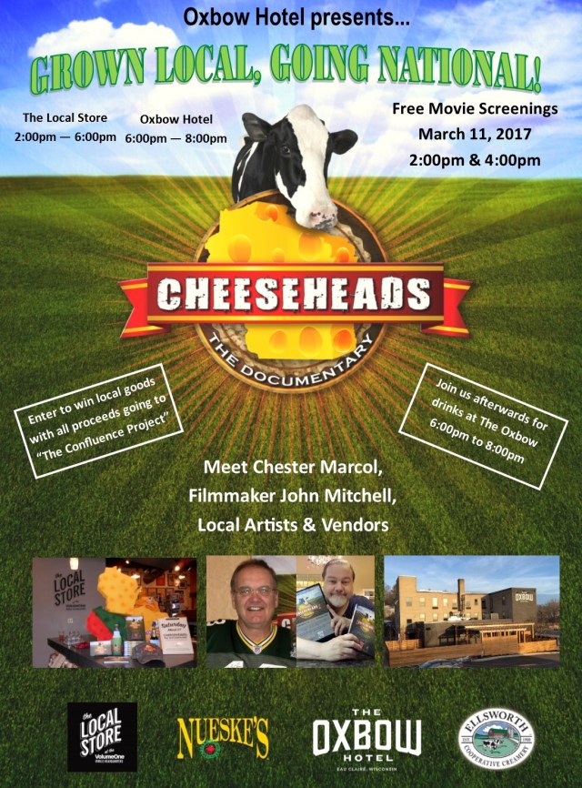 We’ll be at the Local Store and Oxbow Hotel on Saturday March 11th. Information is below. Come join us for some Cheeseheads fun with snacks provided by Ellsworth Cooperative Creamery and Nueske’s Applewood Smoked Meats.