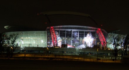 A couple of night shots of Super Bowl XLV stadium (aka Cowboys Stadium). Note the giant Aaron Rodgers and “that Steelers player” on the outside wall of the stadium. Many more pictures to come after we arrive in Arlington Tuesday afternoon. We’ve already lined up a number of shoots and interviews, with even more to … Continue reading