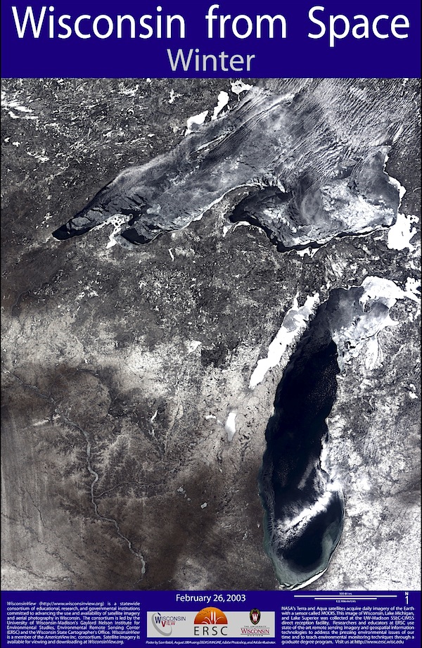 And to abide by copyright law: Image courtesy Liam Gumley, Space Science and Engineering Center, University of Wisconsin-Madison, as is the photo below of Wisconsin From Space in the WINTER… Not all that different really.